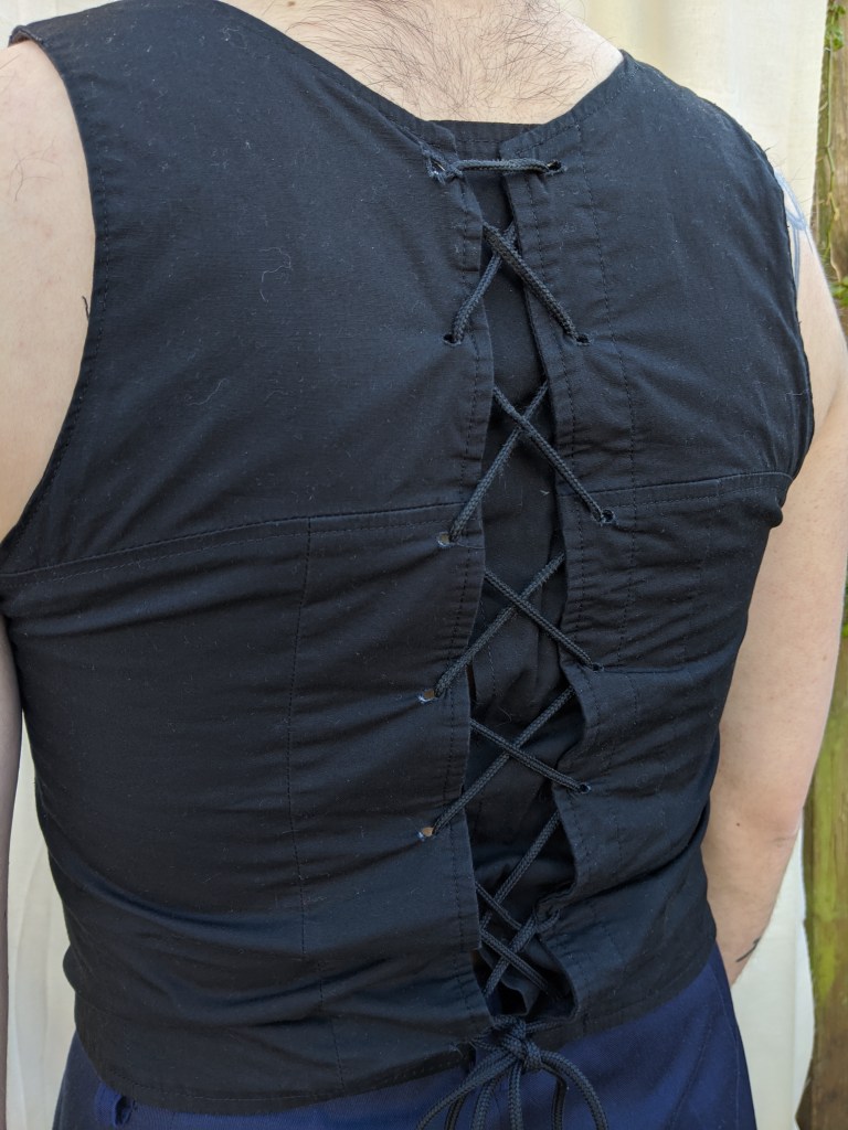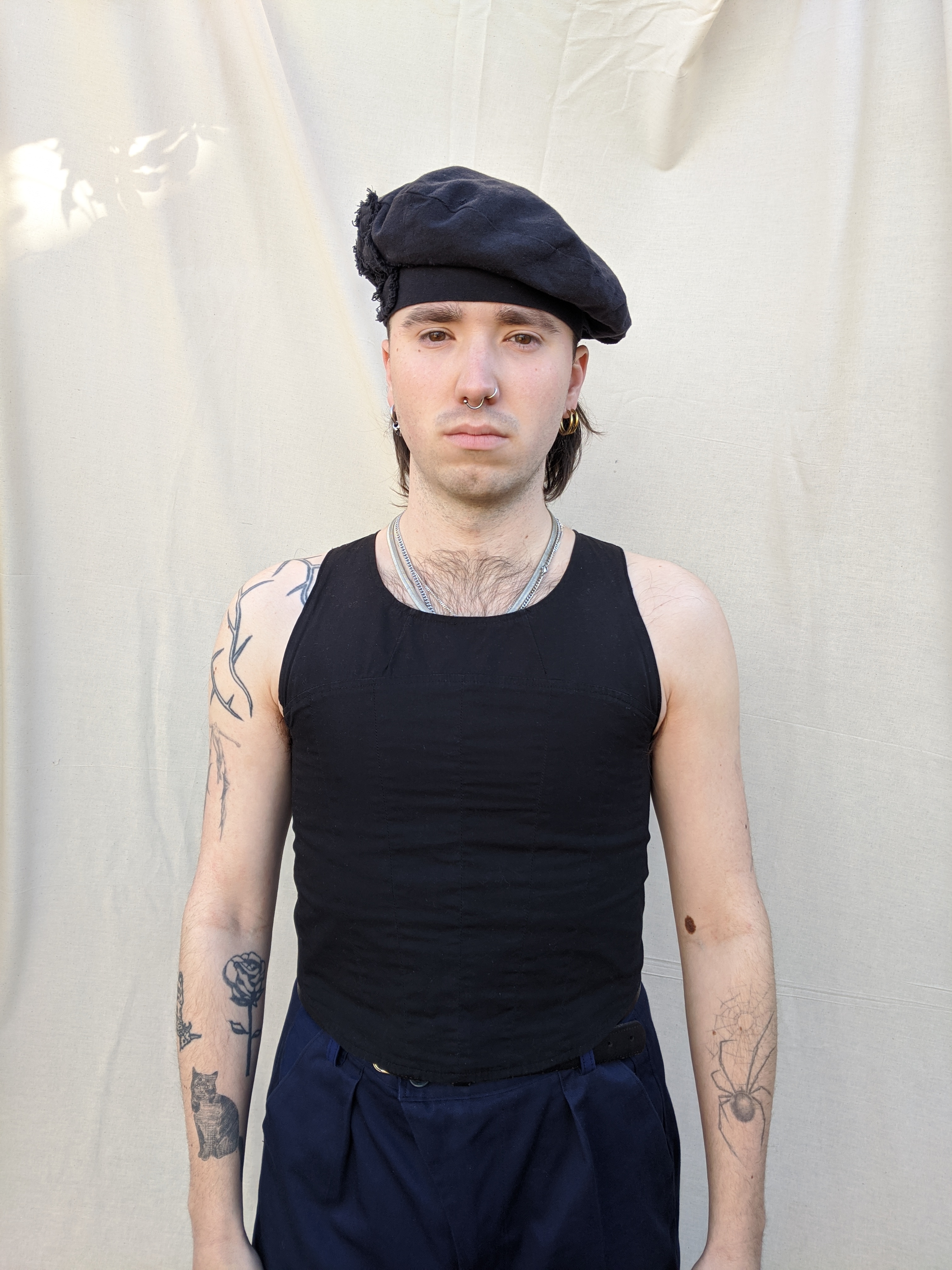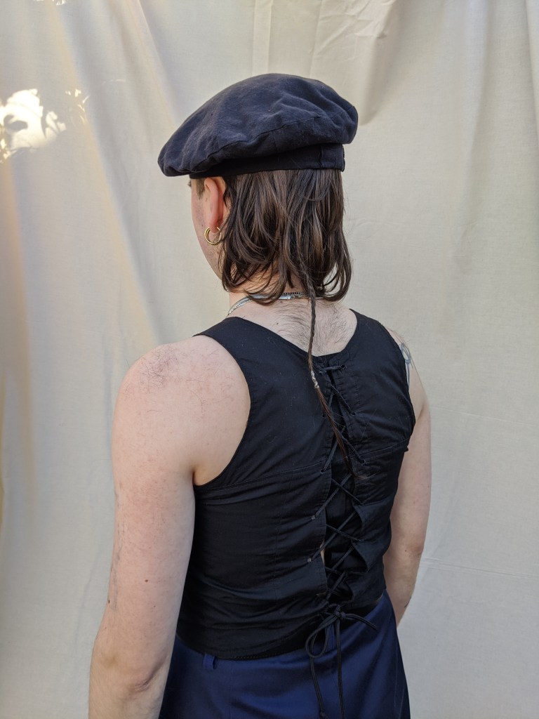 A non stretch cotton bespoke fitted vest top that I designed, pattern cut and made for myself in 2024, as a alternative to the corset for men on the nights out and at festivals.