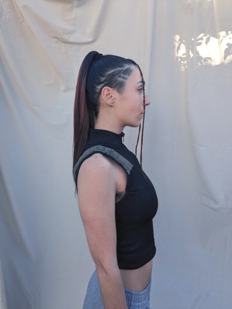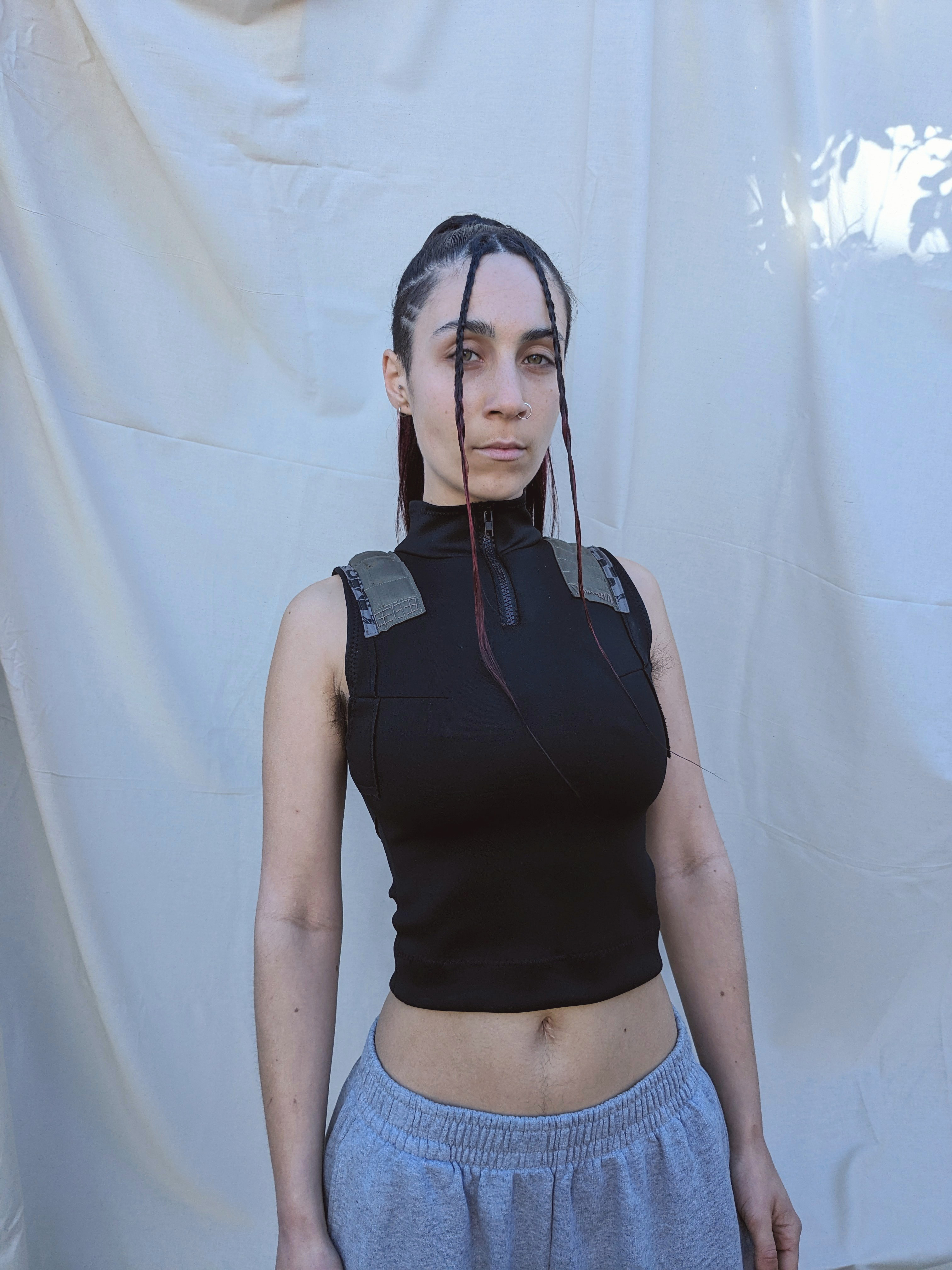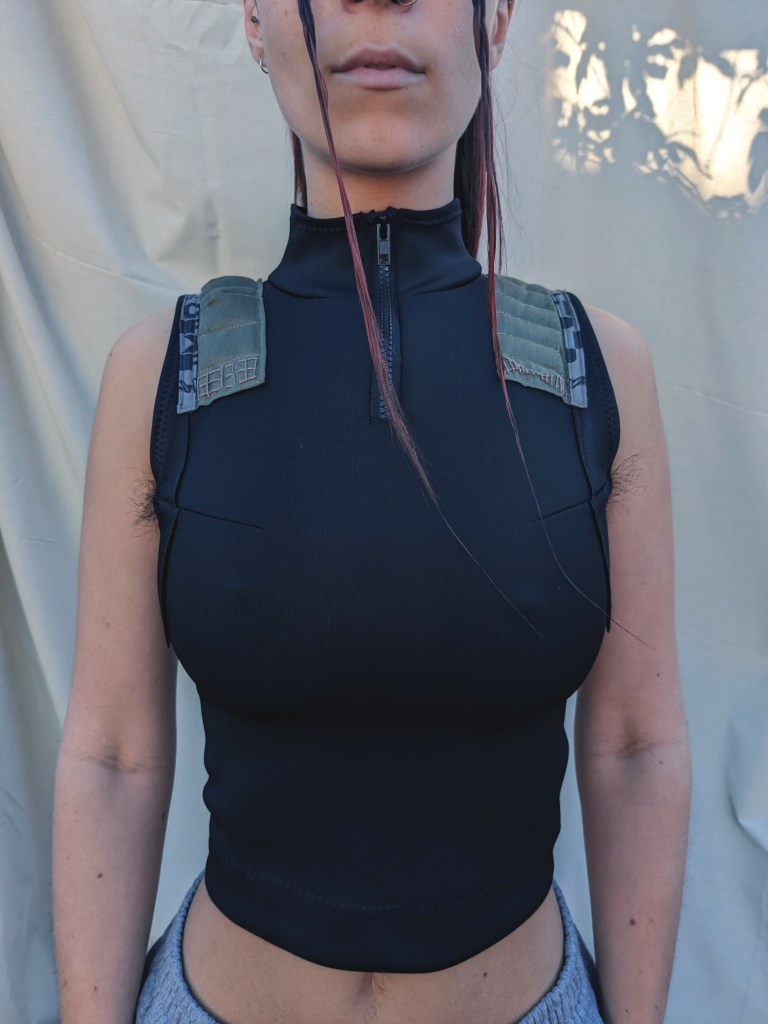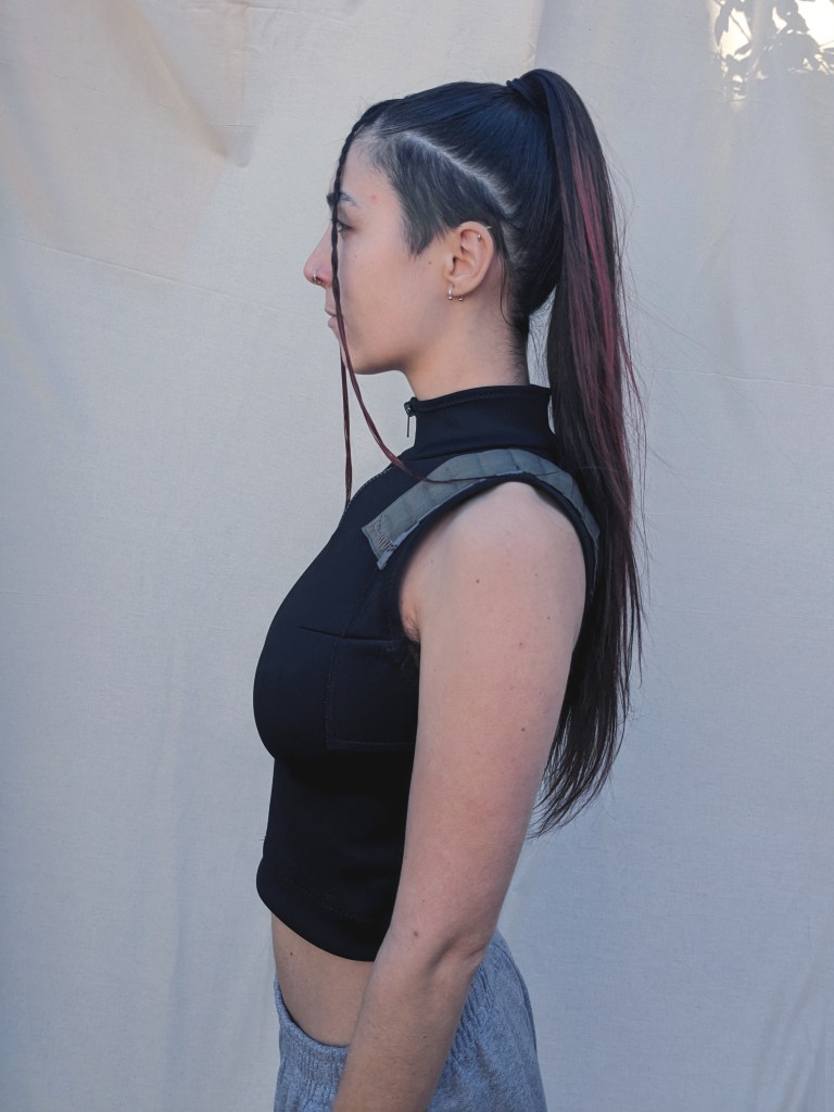 I worked with Bristol based electronic musician and singer EJ Akin to create a structured tight fitted vest top with a zip up high neck. They wanted a top to perform in on stage which felt supportive and fit their aesthetic with a few interesting details while still being subtle.