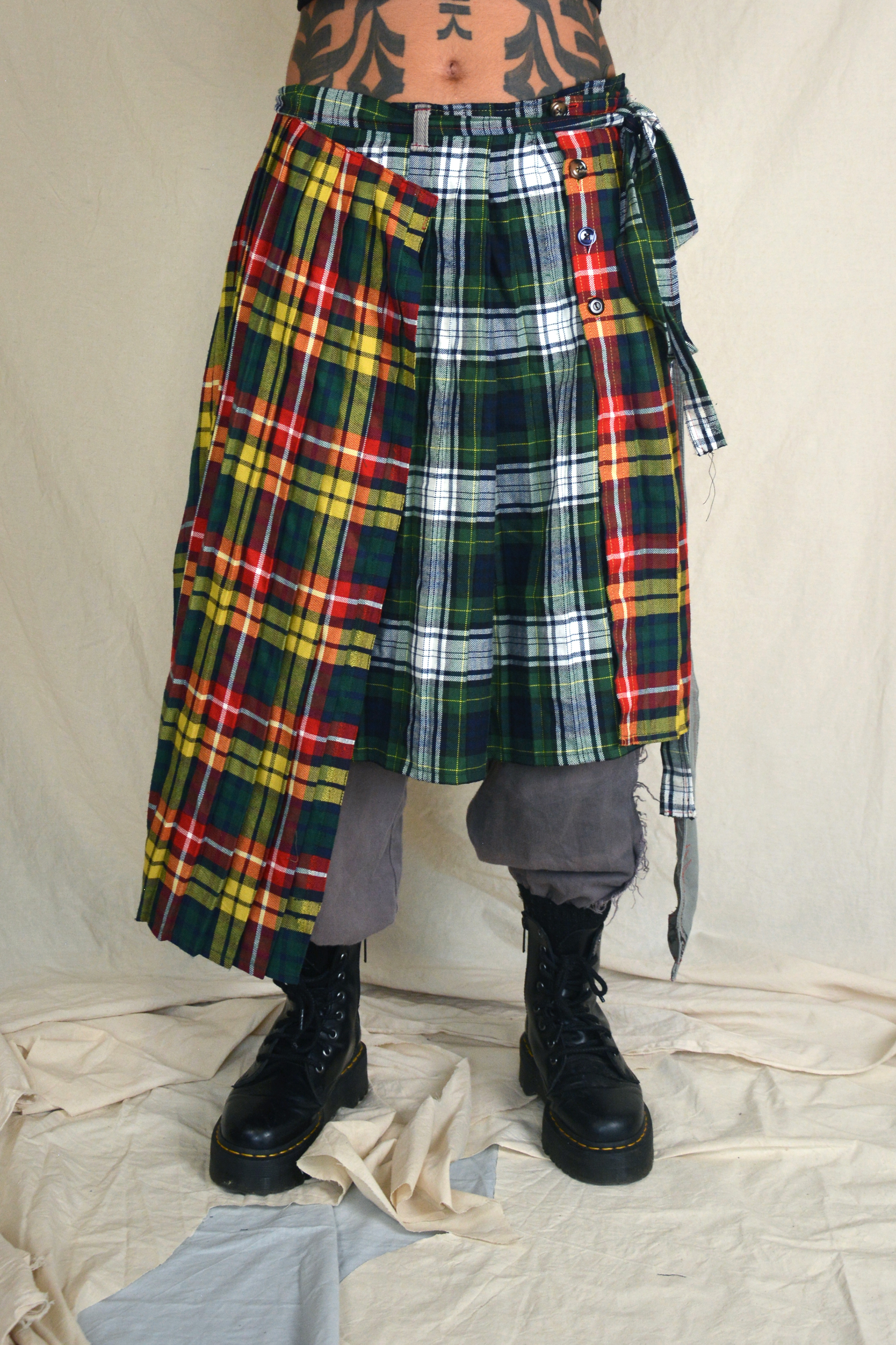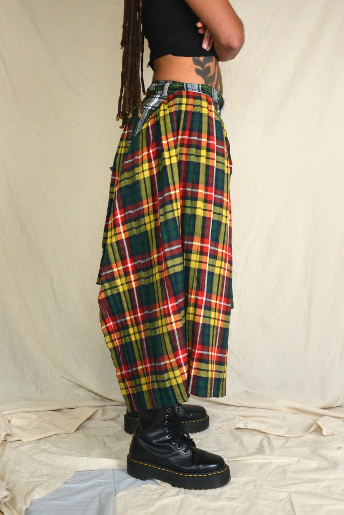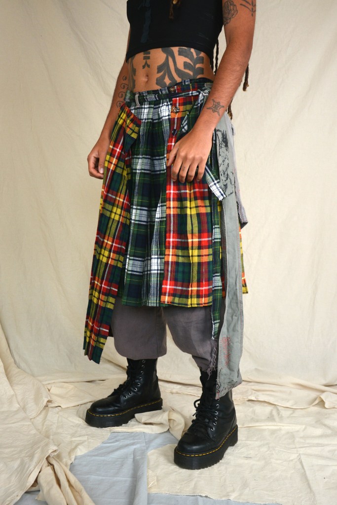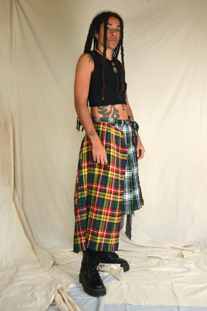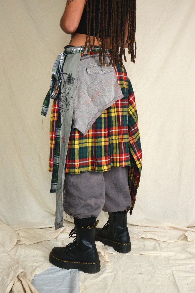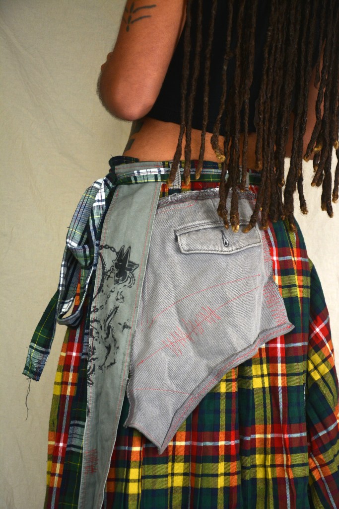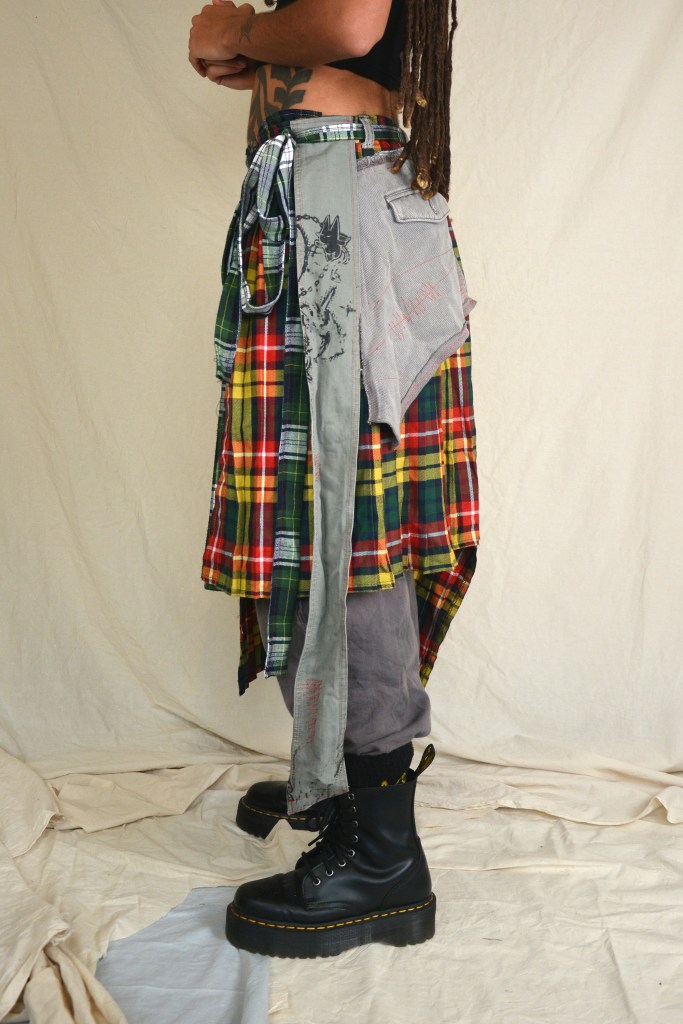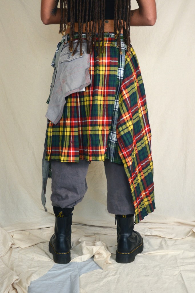 In summer 2024 I worked with Grove to create this wrap kilt from deadstock plaid fabric I was gifted by a friend. I used a body form to help me drape the the side panel around the hip. It also features various pieces from a pair of old grey jeans. I created the waist size that the buttons met at to be slightly bigger than the true waist, allowing Grove to wear the kilt at different points on their waist and use the fabric belt tie to adjust it to the precise size.