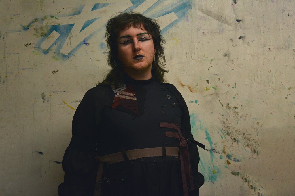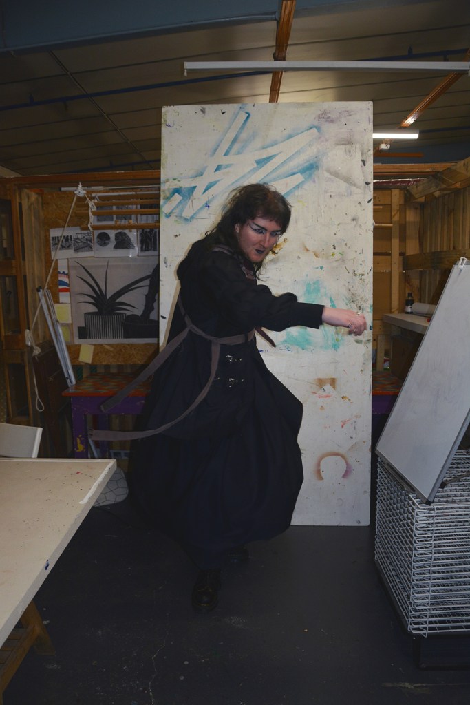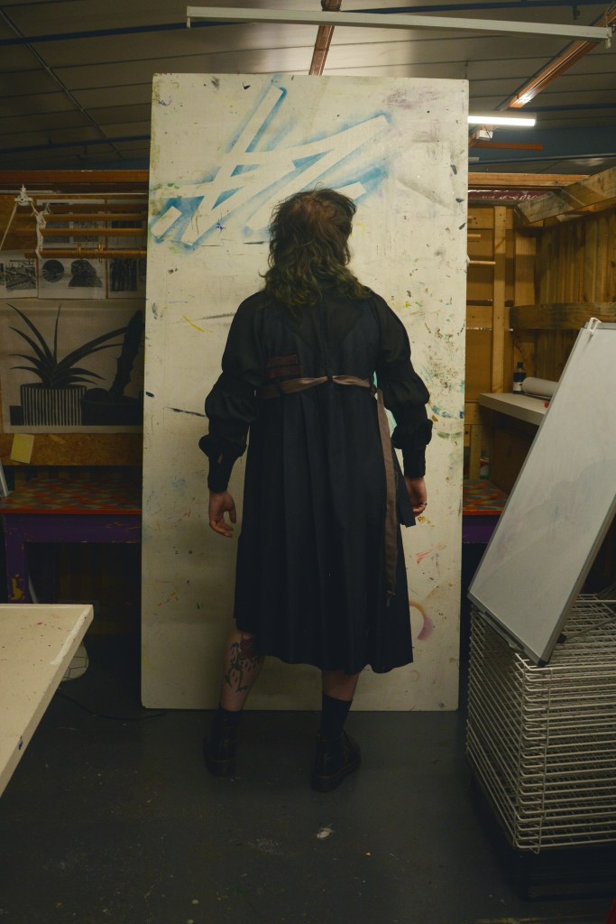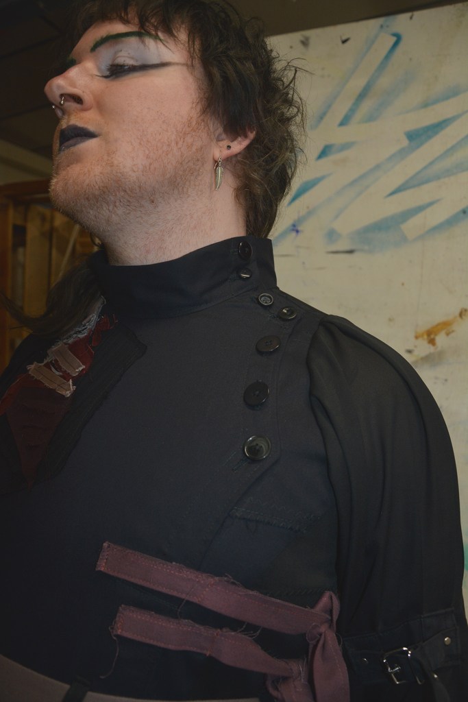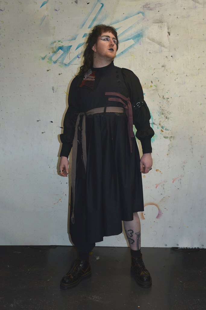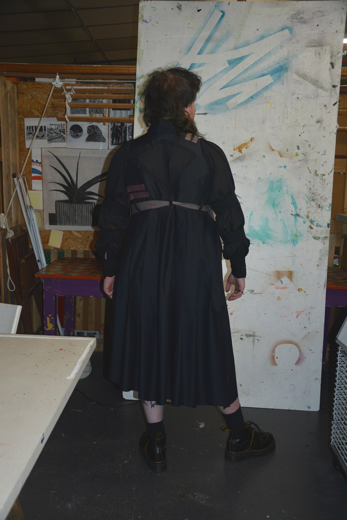 In March of 2025 I was approached by the Bristol based experimental industrial noise artist Monika Badly . They commissioned me to make a knee length dress , we spent a few hours working on the design and then over the next few weeks I pattern drafted and made it. We ended up with a black dress, made from cotton drill, polyester slightly transparent sleeves with a diamond in the same fabric on the back. Featuring a button closure inspired by vintage fencing jackets.