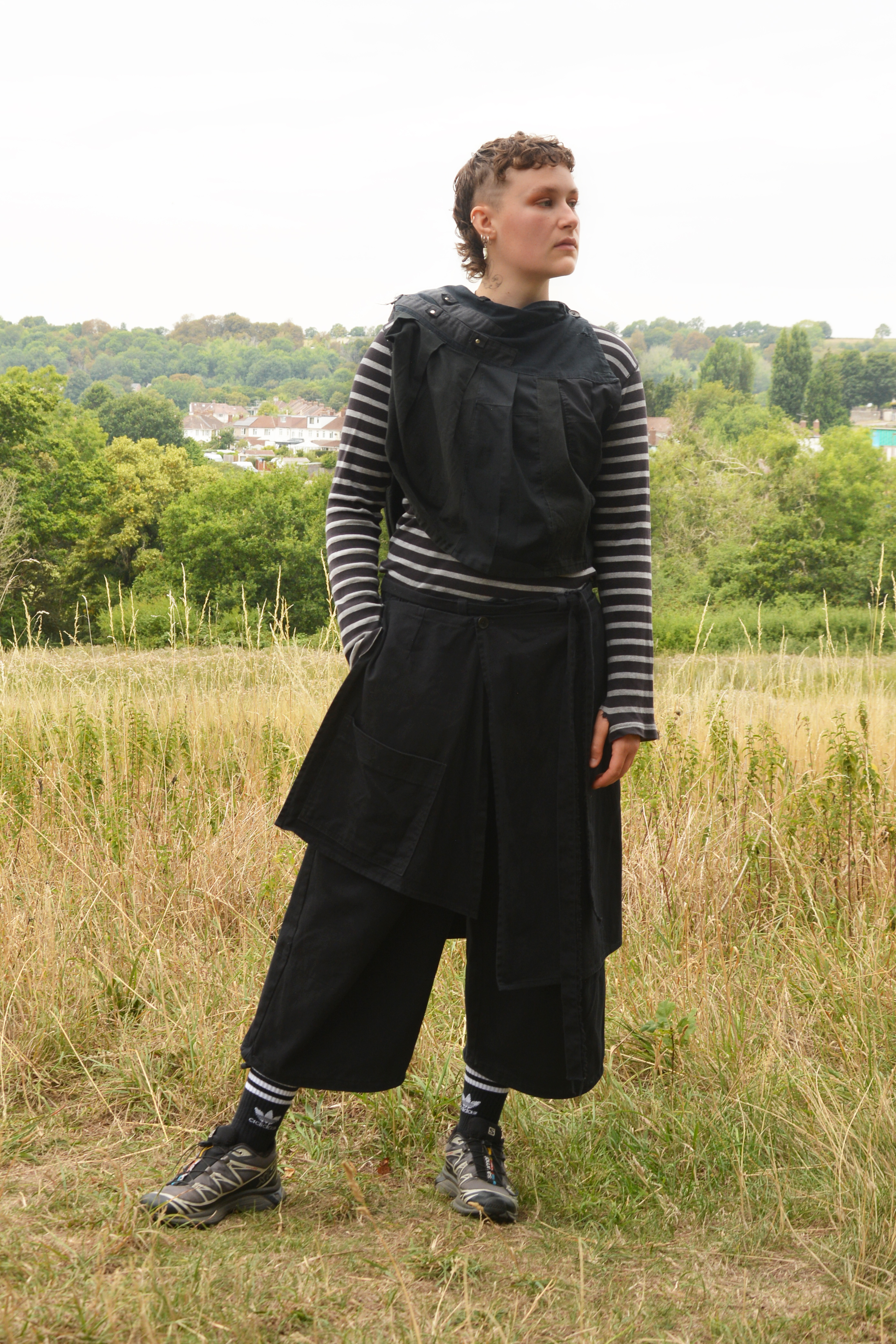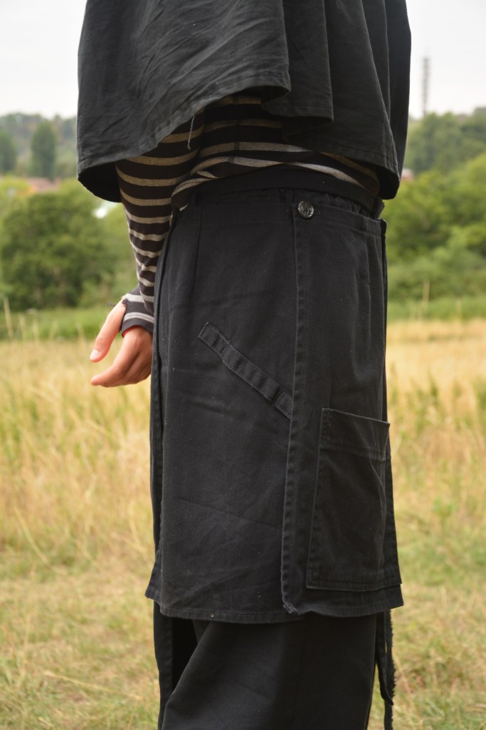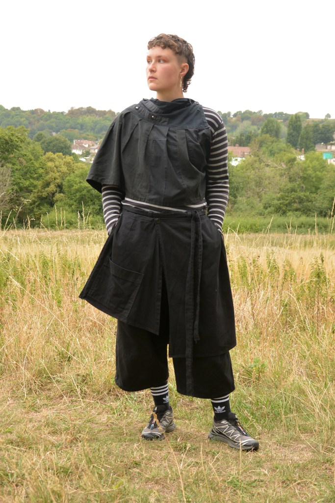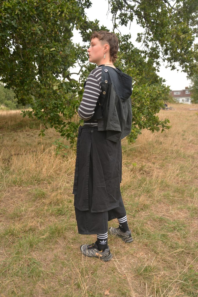 In March 2025 I worked with Bristol based musician T L K . they came to me asking for a trouser inspired by the Maharishi Hakama Trousers and I came up with my own design with removable skirt panels and a fabric belt tie, was a really enjoyable process working with them and witnessing their joy of the final result.