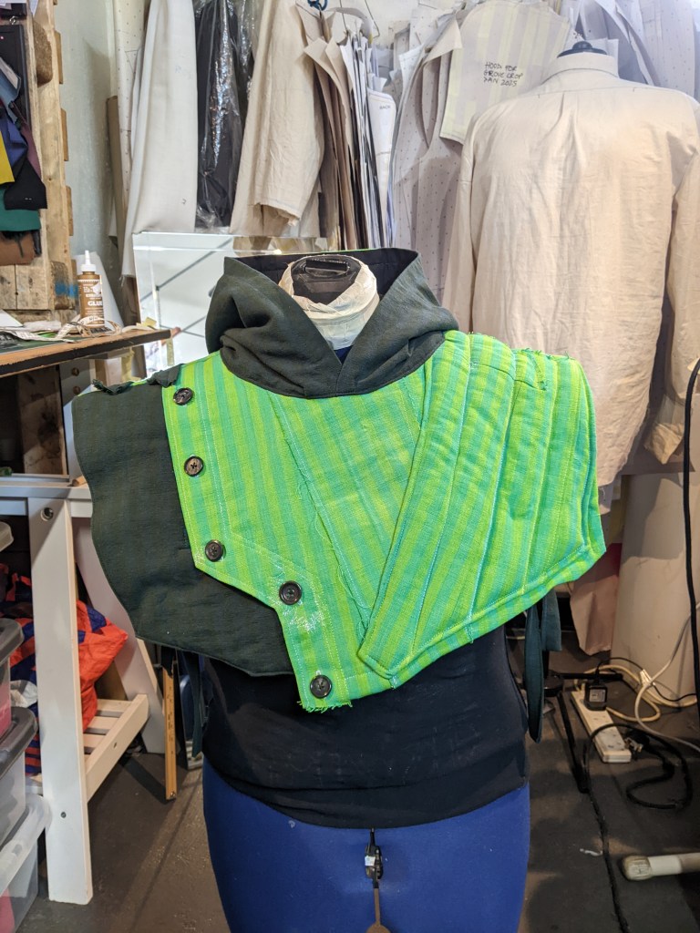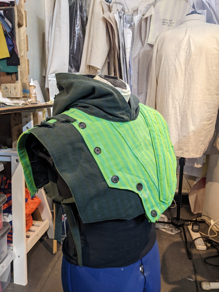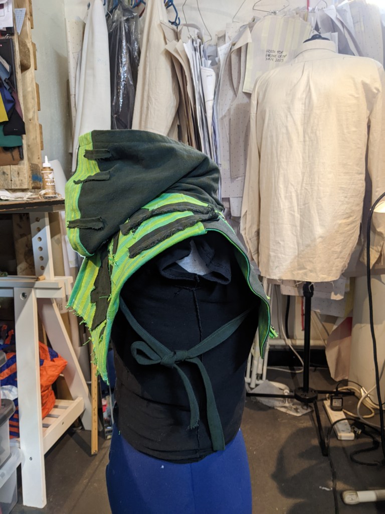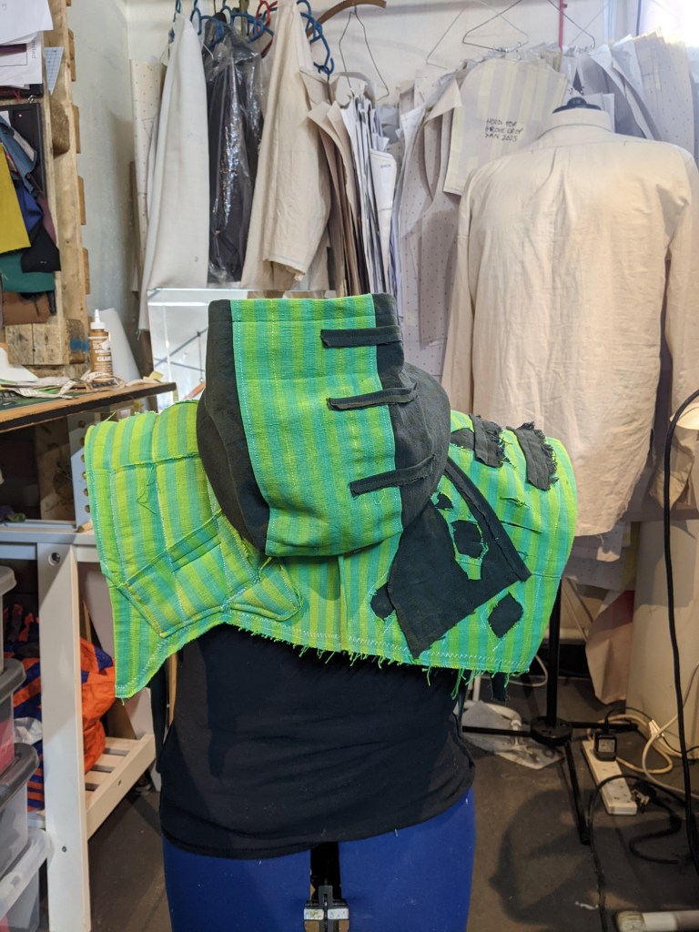 I created this bespoke piece for London musician Taliable. We decided on a hooded cropped vest with ties beneath the arms, it features a padded shoulder which I tailored round the shape of a shoulder so it adds a lot of structure to the piece. The two fabrics are the same but the darker one I over dyed black